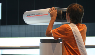 A stereoscopic interactive exhibit playing with the concept of a gambling machine.